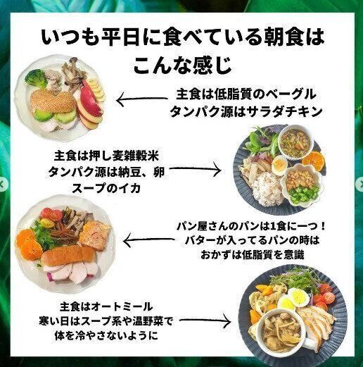 こちらの写真は、いつも食べている朝ごはん。主食は低脂質のベーグルや押し麦の雑穀米、オートミールに。たんぱく源は、サラダチキンや納豆、卵など。寒い日はスープや温野菜で体を冷やさないようにしています。どれもボリュームたっぷりで、これなら体と心も大満足ですよね。