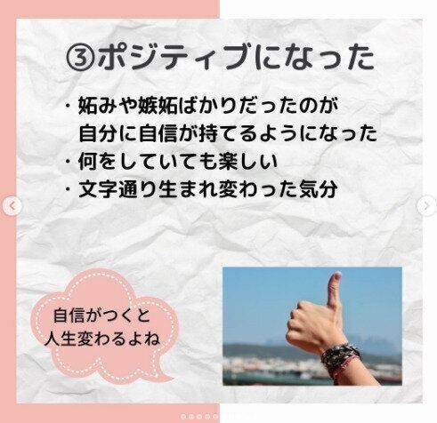新しい自分にチャレンジしたり、たくさんほめてもらったり。大きな自信につながり、性格までポジティブになったと言います。「自信がつくと人生が変わる。文字どおり、生まれ変わった気分」なのだそう!