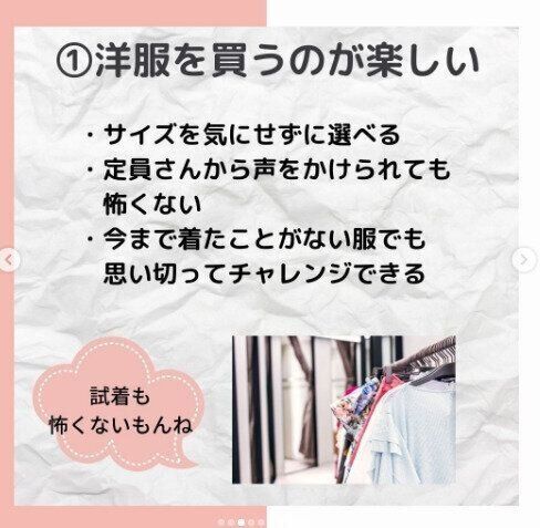 まずは、「洋服を買うのが楽しい!」ということ。サイズを気にせず選べたり、店員さんに声をかけられるのも怖くない!今まで着たことのない服にもチャレンジできたりと、試着をすることもこわくない!