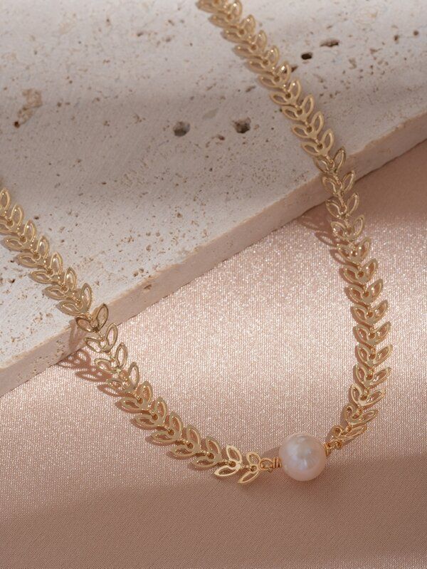 金のリーフのデザインと天然のパールがおしゃれなネックレス。1,320円という値段で天然パールのアクセサリーが購入できるのはお買い得ですね!