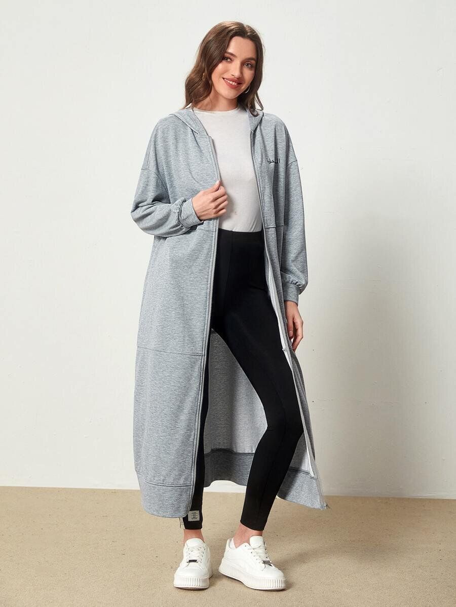ロングのワンピースとしても使えるパーカーです。グレーカラーは、顔をパッと明るく見せてくれます!太ももから足首までしっかりカバーされるので、レギンスの上から羽織っても安心です。