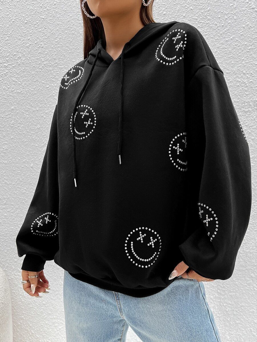スマイルマークが描かれているパーカーです。ラインストーンが使われているので、普段使いでもおしゃれに見せてくれます!人と被らないパーカーを探しているかたに、おすすめです。