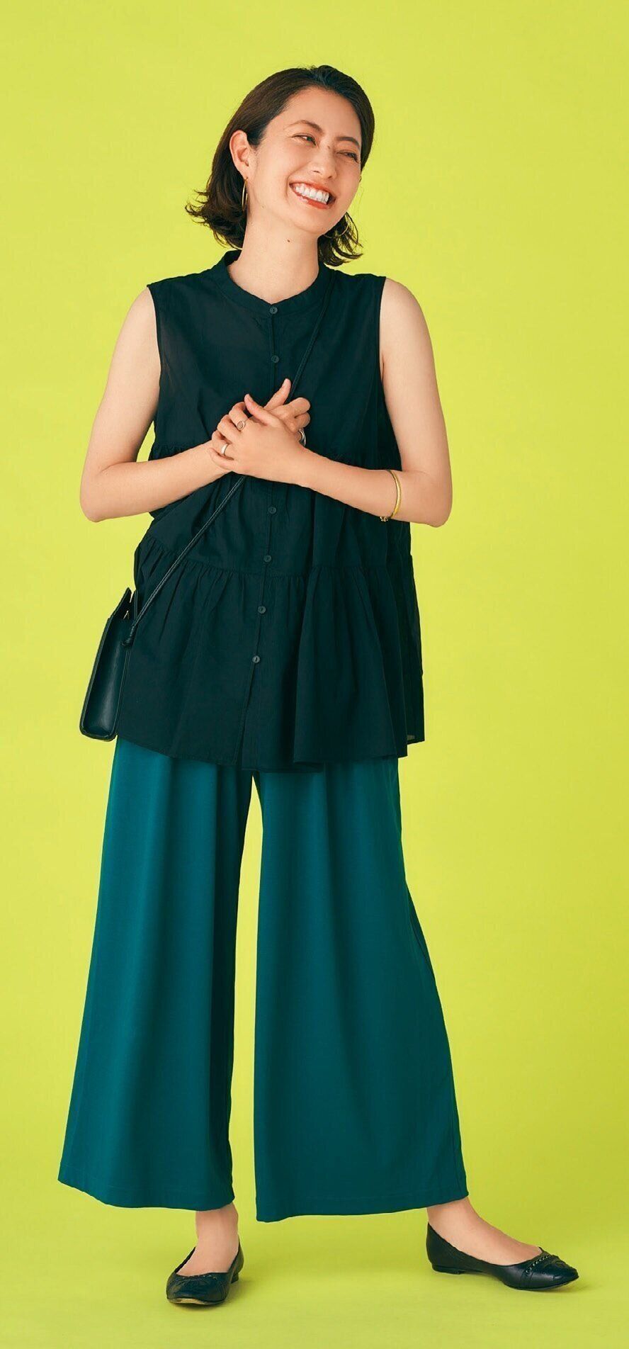 主役であるグリーンのパンツを引き立てるため、ほかのアイテムをすべて黒で統一すると洗練されたコーディネートが完成。デザイン性のあるトップスを選べば、おしゃれ感アップ。「コットンギャザーブラウス」(ブラック、ホワイト、イエロー・全3色)¥1,990、「レザータッチミニツールショルダーバッグ」(ブラック、ブラウン・全2色)¥1,990/ユニクロ その他私物