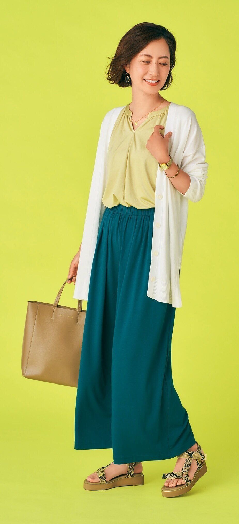 トップスをコンパクトに見せると、脚長効果が高まります。長め丈のカーディガンをボタンをとめずに羽織れば、縦ラインが強調されてより細見え!「UVカットVネックロングカーデ」(オフホワイト、ブラック、カーキ・全3色)¥2,990、「サテンジャージーT(ノースリーブ)」(ベージュ、ブラウン、ネイビー・全3色)¥1,500/ユニクロ その他私物