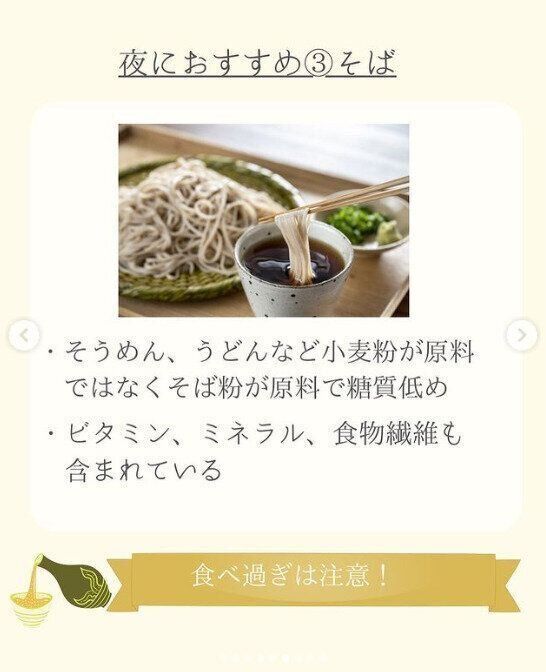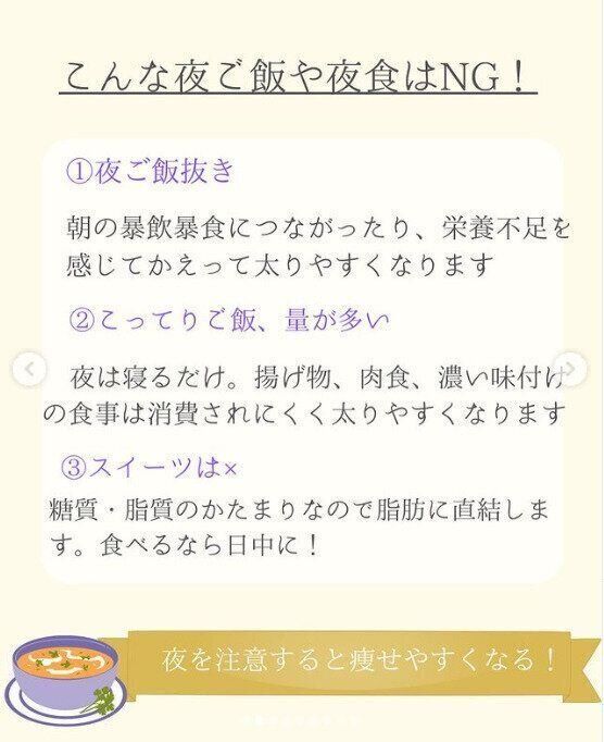 「夜は食事をとらない!」「お楽しみタイムの夜食禁止!」など厳しく制限をしてしまうと、ストレスがたまりリバウンドしやすくなります。食べるものを上手に選んでダイエットを継続したほうが痩せやすいと、risa.suzuki.yogaさんも言います。