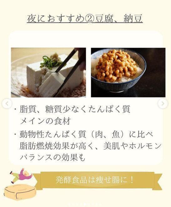 糖質や脂質が少なく、たんぱく質中心の食材です。脂肪燃焼効果や美肌効果も期待できますね。発酵食品は「腸活」にもつながります。