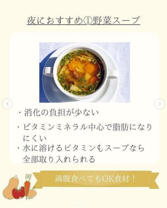 まずは、野菜スープです。risa.suzuki.yogaさんいわく、野菜はお腹いっぱい食べてもOKな食材。消化の負担も少なく、眠りも深まるのだそう。ビタミン、ミネラル中心で脂肪になりにくく、水に溶けるビタミンもスープなら全て体に取り入れることができます。
