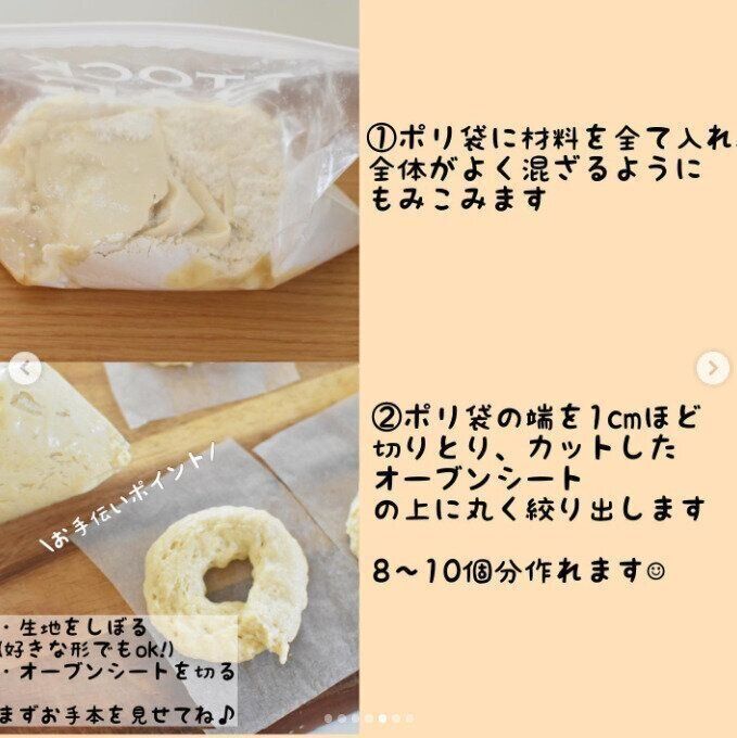 材料はホットケーキミックス200g、絹ごし豆腐150g、本みりん大さじ2をジッパーつきのポリ袋に入れて、全体がよく混ざるように揉みこみます。ポリ袋の端を1cmほど切り取り、カットしたオーブンシートの上に下の写真のように丸く絞り出します。