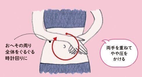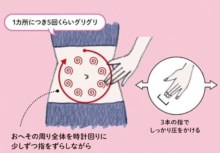 片手の人さし指、中指、くすり指をそろえ、おへその上に密着させる。そのまま押し込むようにして、5回くらい小さく円を描き、おなか全体をほぐす。