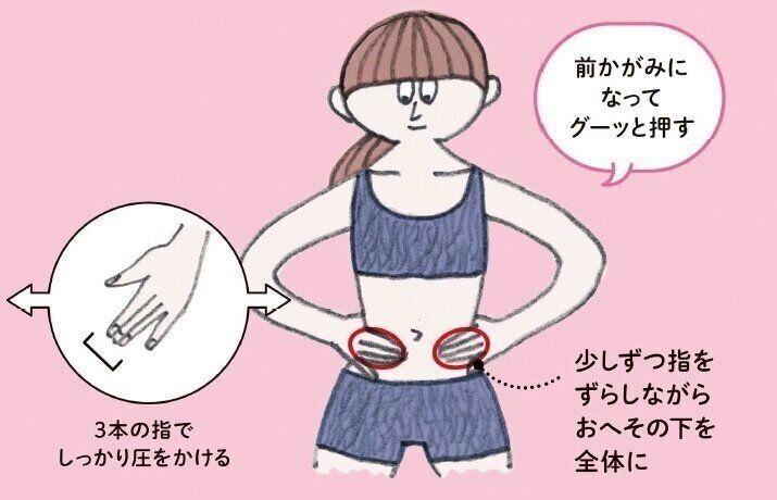 両手の人さし指、中指、くすり指をそろえ、おへその左右斜め下に当てる。指をグーッと押し込むように圧をかけながら、深く押す。