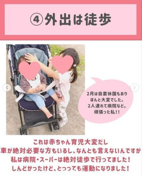 運動は何をしているのか教えてもらいましょう。なかなか時間がとれない育児中、yua__dietmamaさんが心がけていたことは、できるだけ徒歩で外出すること。病院、スーパーは絶対に徒歩だったと言います。「しんどかったけど、とっても運動になりました!」。