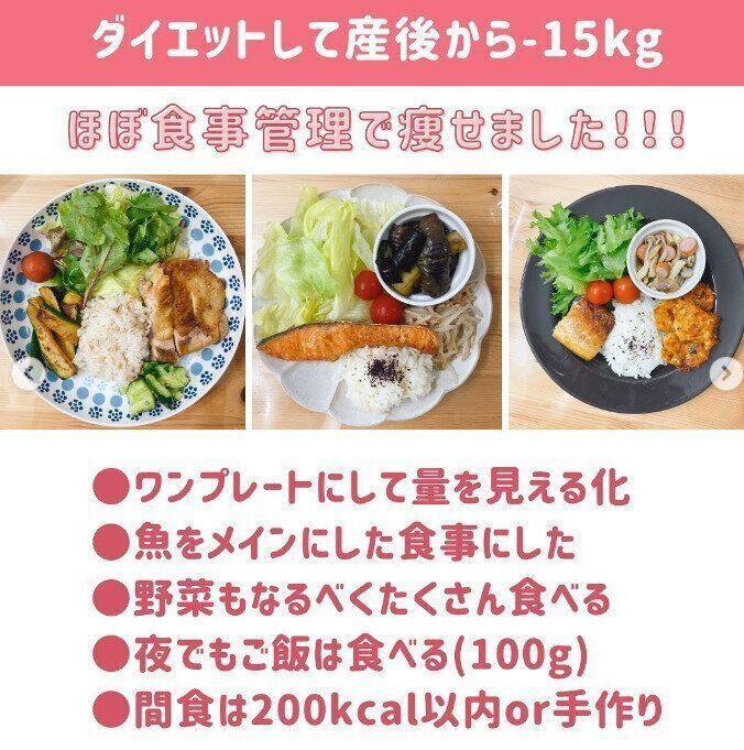 産後ママのダイエットは想像以上に時間がなく挫折した人も多いはず。食べないダイエットも健康を害します。だからこそ、yua__dietmamaさんのダイエット方法は、多くのママたちの参考になることばかりでした。無理のない食事管理をするためにワンプレートに盛りつけることで食べる量をチェック。バランスよく盛りつけることで栄養面もばっちり。時間がないなら子どもたちを連れて歩いてお出かけすることで運動をプラス。