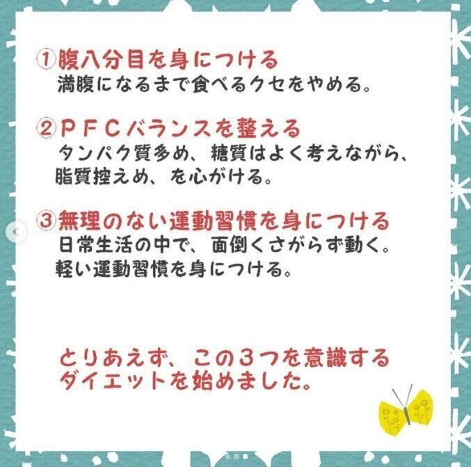 という3つ。自分が太ってしまった原因を冷静にみつめたからこそ、自分にあったダイエット方法をチョイスすることができたのですね。これをダイエットを始めた2年前から今まで、ずっと継続していることもすごいことですよね!