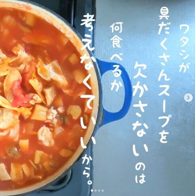 「栄養バランスの数字を計算して、あれは食べて、これは食べずに…」なんて考えながら続けるダイエットはなかなか続きません。だからchakke147さんは、「具だくさんスープダイエット」を取り入れています。野菜はたっぷり、鶏肉も入れるので、タンパク質もしっかり。ここに炭水化物をプラスするだけで栄養バランスもOKなのだそう。いそがしいときでも、「とりあえずこれを食べていれば大丈夫!」という鉄板メニューがあれば、ダイエットも楽に続けることができるのですね。