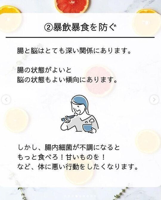じつは、腸と脳はとても深い関係にあります。腸の状態がよいと、脳の状態もよい傾向にあると言われているのです。だから腸内細菌が不調になると、「もっと食べろ!」と暴飲暴食を起してしまいたくなるのです。