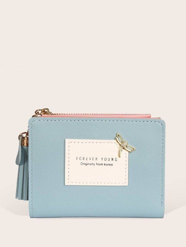 タッセルつきで中がピンクになっているブルーのコンパクトな財布。中にはカードを入れるところもついています。口コミによるととてもかわいいそう。これでワンコインの500円はうれしいですね!