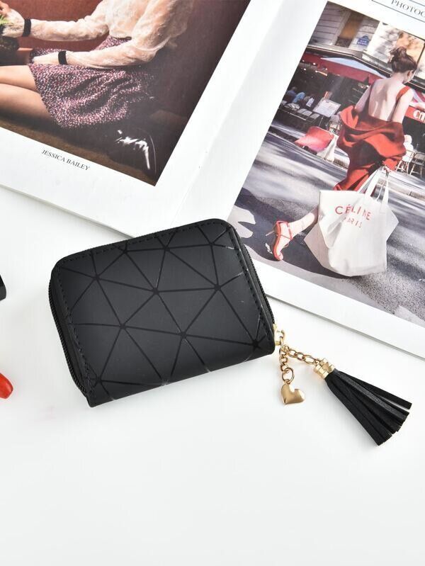 幾何学模様でタッセルがついたコンパクトなサイズの財布。口コミによると、小さなカバンに入れるのにちょうどよいそう。つくりもしっかりしているとのこと。