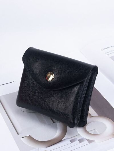 黒いシンプルなスナップボタン付つきのコインケース。口コミによると、思ったよりも大きなサイズで使いやすいとのこと。小銭やカードなどがたくさん入るので、便利なようです。