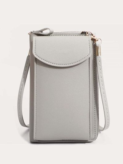 シンプルなグレーのスマホケース兼財布。スマホを入れるだけでなく、カードや小銭なども入れることができます。口コミによると、ハンカチなども入り、財布やバッグなどを持ちたくない時にとても重宝するようです。