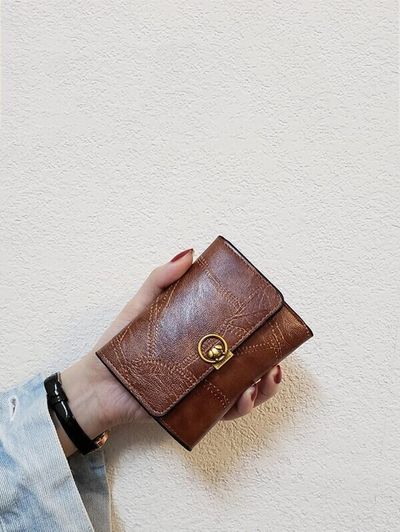 使い古したレザーのような見た目のコンパクトなお財布。ゴールドの留め金がアクセントになっています。口コミによると、留め金の部分はワンちゃんになっているのだとか。かわいいデザインですね。