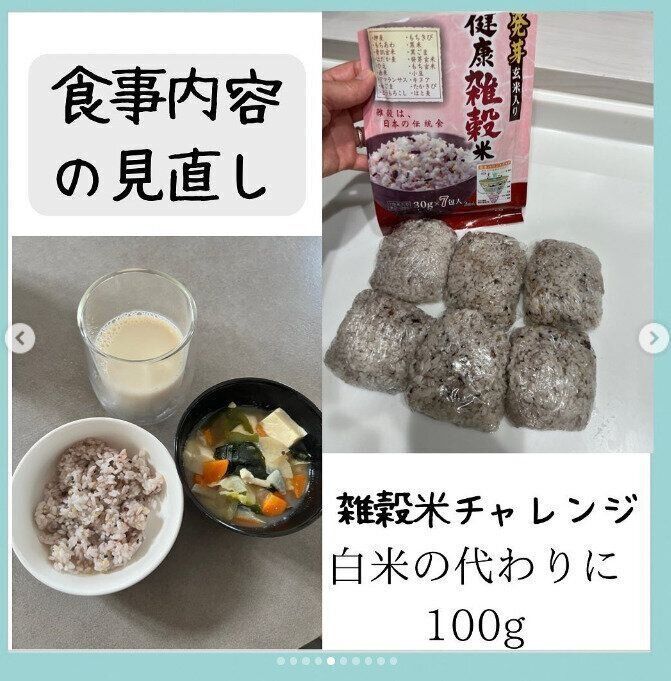 40代のダイエットに無理な食事制限などは禁物です。himawari.45dietさんのダイエット方法は、食生活を整えることが9割、ストレッチ&トレーニングをすることが1割、という比重なのだそう。当初はダイエットアプリなどをうまく使いながら、栄養バランスを考えた食事内容に切り替えました。白米の代わりに雑穀米にチャレンジしてみたり、具だくさんのお味噌汁を取り入れてみたり。健康にも気をつかっていくのが40代のダイエットなのですね。