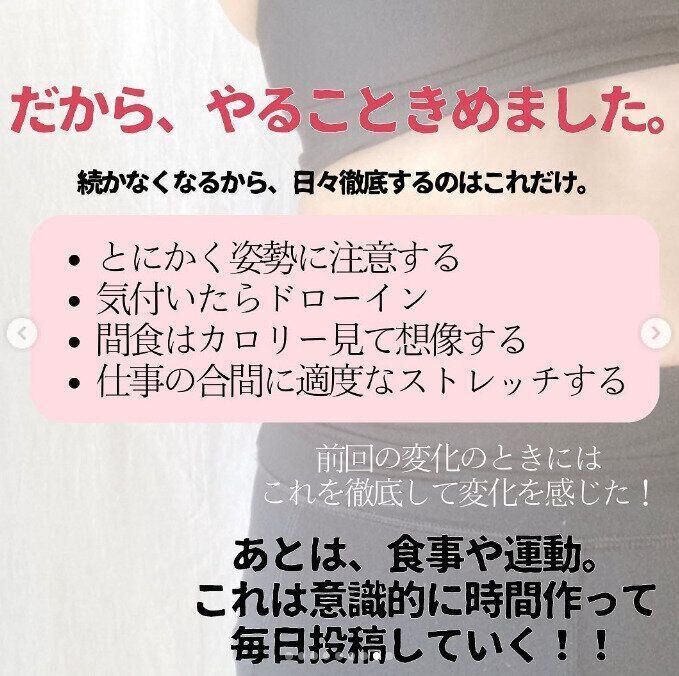 ダイエットをスタートしたものの、仕事や家事のいそがしさでなかなか続かない!だから、日々やることを決めて、意識的に時間をつくることを心がけました。「姿勢をよくする」「気がついたときにお腹を凹ませたり膨らませたりするドローインをする」「仕事の合間にストレッチ」など、たとえ少しずつでも継続することを目標に行いました。