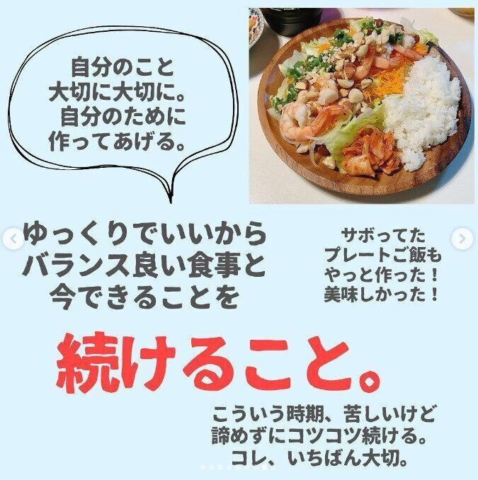順調に進んでいたダイエット。何かのきっかけでリバウンドしてしまった経験は多くの人にあるはずです。でも、自暴自棄にならず、どうすれば心を落ち着かせて食欲をおさえることができるのか。yaseru_ayaさんは、まわりの声にもきちんと耳を傾け、たどりついた答え。それは、「大切な自分の体のために、丁寧な食事を心がける」ことだったのです。おいしい食事で体も心もパワーはみなぎり、また適度なトレーニングも取り入れることができるはず!