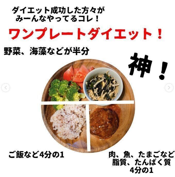 ワンプレートに食事をのせて、栄養バランスや量を目で見て確かめることができる「ワンプレートダイエット」の方法を取り入れています。写真のようなバランスで食べれば、栄養バランスもばっちり。食べすぎを防ぐこともできるのだそう。