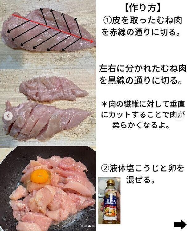 つくりかたです。皮をとりのぞいた鶏むね肉900gを、写真のように切ります。肉の繊維に対して垂直にカットすることで肉が柔らかく仕上がります。鶏むね肉に、液体タイプの塩こうじ30gと卵1個を混ぜこみます。プロテイン20gを加えてさらに混ぜます。あとはパン粉60gをつけて、150~160度の少なめの油で揚げればできあがり!