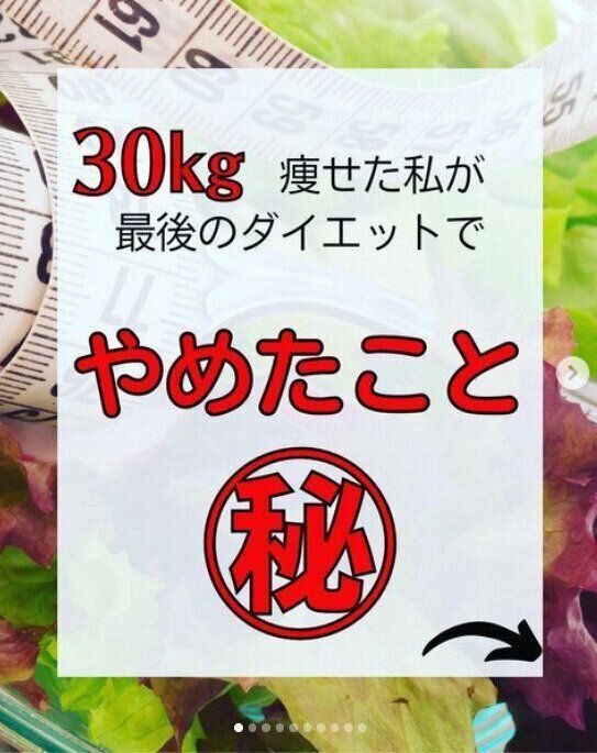 ダイエットのコツは「やめたこと」でした。若いころからさまざまなダイエットに挑戦してきたそうですが、「今回のダイエットは、とても楽しくて「ハッピー」だと思えるダイエットだというのです。30kg_diet_ayaさんが、やめたことはこの6つ。