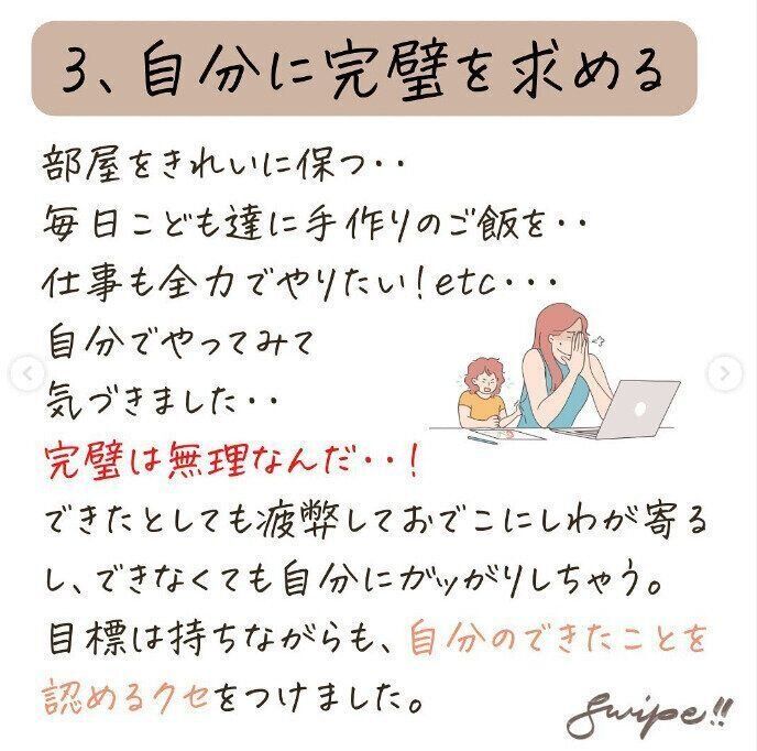 いつも部屋をきれいにし、子どもたちには毎日、手づくりのごはん、仕事も全力でがんばりたい!そう思っていたnomado.career.counselorさん。でも、やってみて、完璧は無理なんだと気づいたと言います。できない自分にがっかりしてしまうことも。目標はもちながらも、「自分のできたことを認めるクセ」をつけたと言います。