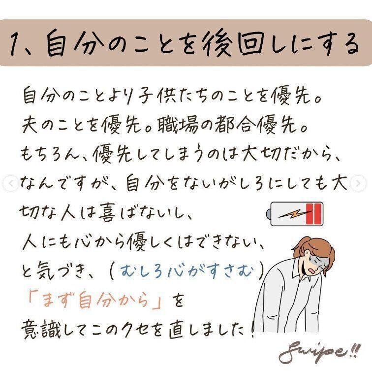 まずは「自分のことを後まわしにしてしまう」クセがあったと言います。自分のことよりも、子どものこと、夫のこと、職場の都合。もちろん大切だから優先しているとは思いますが、自分をないがしろにしてしまっていました。これでは、人にも心から優しくはできないと気づき、「まずは自分から!」を意識して、このクセを直したのだそう。