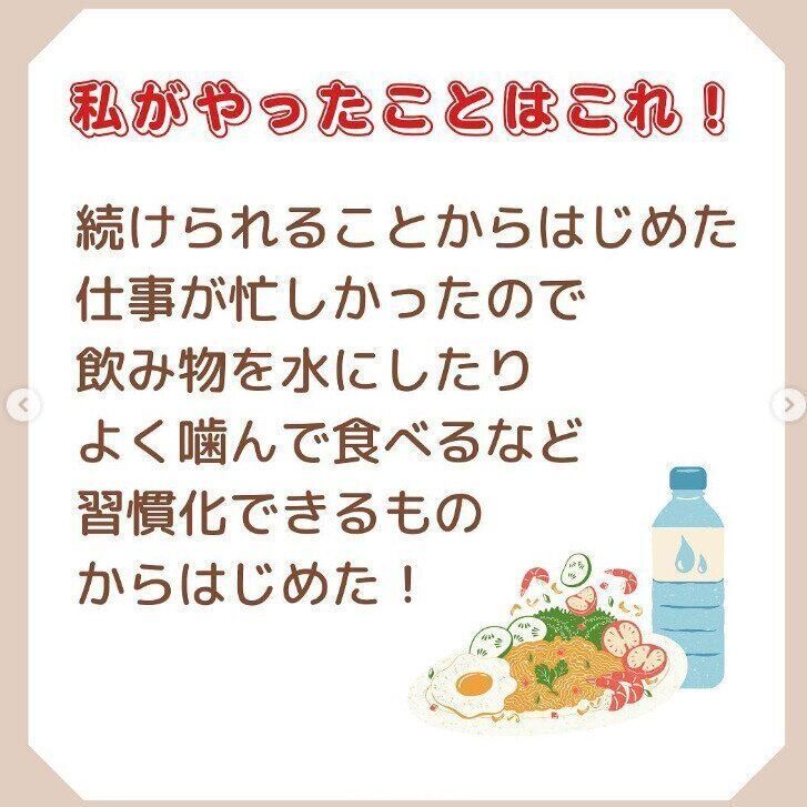 仕事がいそがしかったこともあり、あれもこれもはできません。まずは続けられることから始めました。飲み物を水にする、よく噛んで食べるなど、習慣化できることからスタートしました。