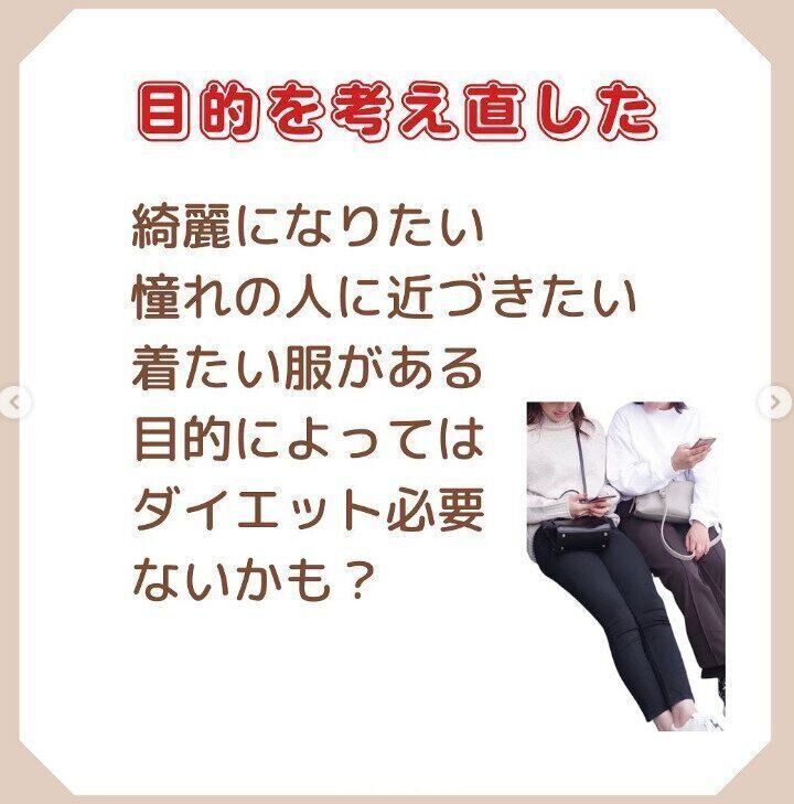 まずは、「なぜ痩せたいのか?」という目的をあらためて考え直したからだと言います。ura_diet_933さんには「理想の私に近づきたいから!」という明確な目的がありました。目的があるのとないのとでは、やる気が断然違いますよね。