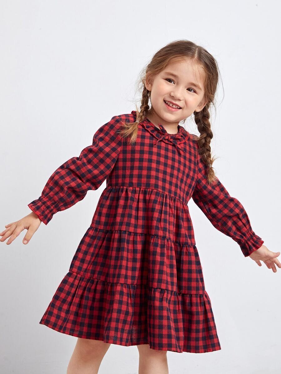 ギンガム 蝶々結びフロント フラウンススリーブ フリル裾 ドレス