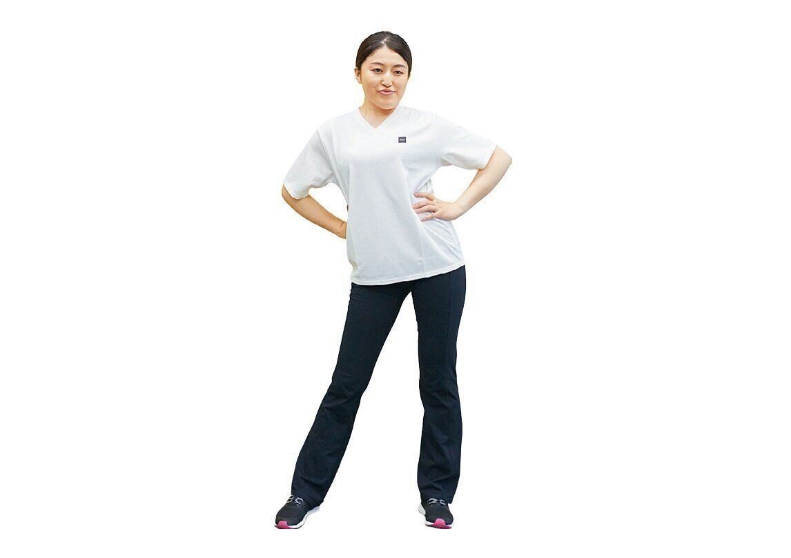 おなか周りを鍛えて、ぽっこりおなかとサヨナラ!腰痛もケアできます。足を肩幅に開き、手を腰に当てた状態でスタート。膝を少しゆるめて立つと、腰への負担が軽くなります。