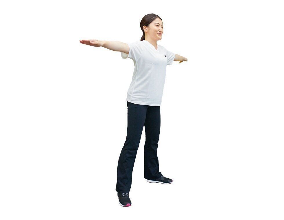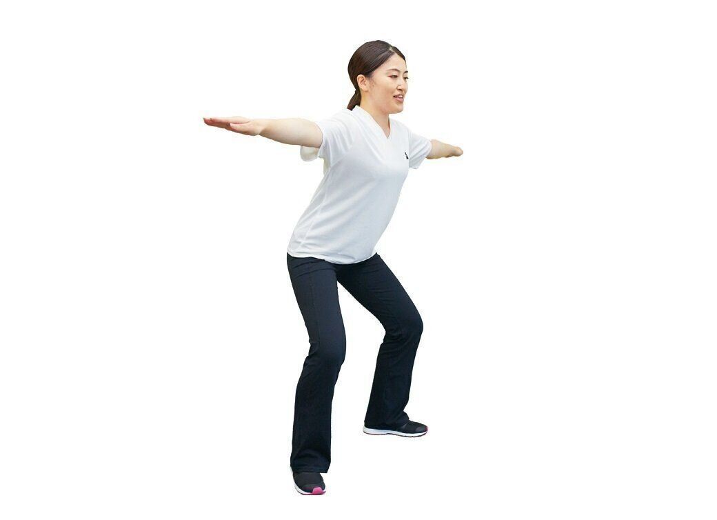 太ももとお尻をキュッと引き締め、ヒップアップが期待できます。足を肩幅よりも少し広く開いて立ち、爪先は外向きに。両手は横に真っすぐ伸ばした状態からスタートしましょう。