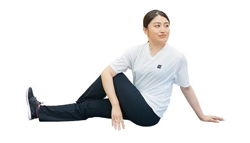 左足を立て、くるぶしを右膝の外側に当てる。右腕を左膝の外側に当て、上半身を左にひねる。腰と太もも後ろの筋肉が伸びていることを意識。反対も同様に行う。