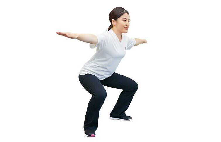 息を吸いながら、5秒かけてゆっくり立ち上がる。これを10セット行う。膝や股関節に痛みがある場合は無理をせず、浅くしゃがむのでOK。
