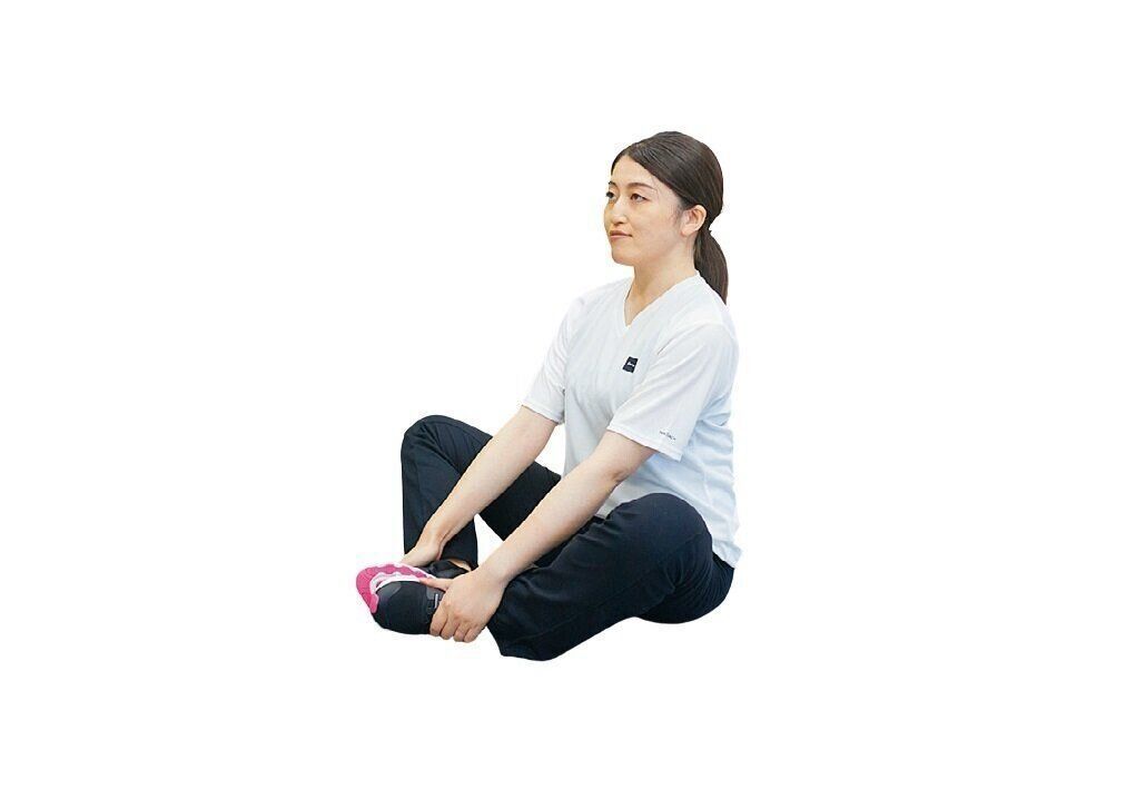 【太もも】両足を両手でつかみ太ももの内側と脚の付け根を伸ばす