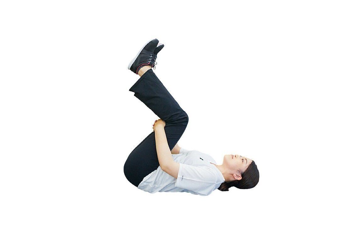背中を床に付ける。両手を膝の裏に当て、太ももを体に引きつける。背中から腰にかけての筋肉が伸びていることを意識する。