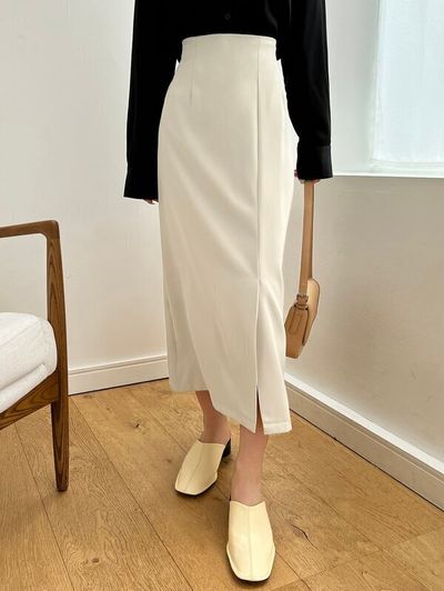 ハイウエストで脚長効果も期待できるスリット入りの白いロングタイトスカート。口コミによると、縫製もしっかりしていて丈もちょうどよかったそう。
