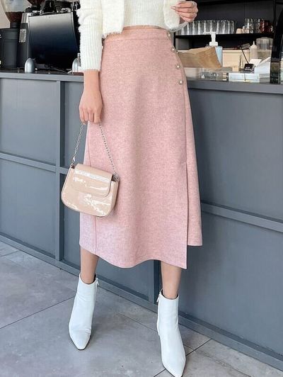 ピンクの生地とパールのボタンが上品な印象のロングスカート。白いトップスやブーツなどとの相性も抜群です。口コミによると、カラーはくすみピンクでとてもかわいいそう。上品な色合いのスカートですね。