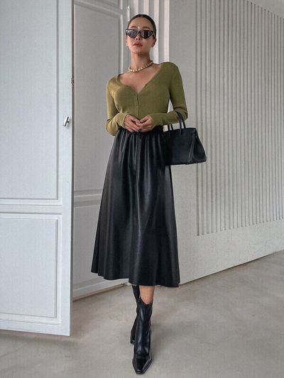 秋冬に大活躍間違いなしのフェイクレザーのスカート。口コミによると、丈はひざ下20cmほど、ウエストはゴムになっているので履きやすいそう。