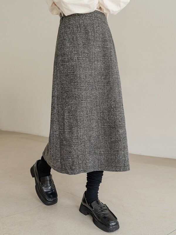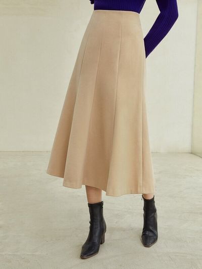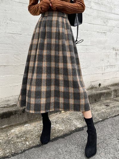 どんなトップスにも合わせやすいカラーのスカート。上質な生地で高見え間違いなしの一着です。口コミによると、ウエストは大きめに作られているよう。とても暖かそうな生地ですね。