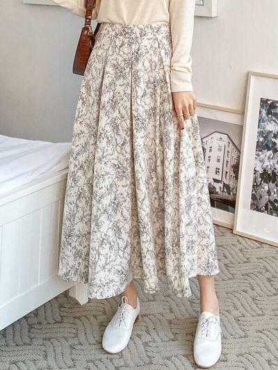 エレガントなフラワープリントのロングスカート。大きめのプリーツが入り、ボリューム感もあります。口コミによると、ウエストは横にチャックが付き、後ろがゴムになっているよう。チャックを開けなくても着脱することができるようです。