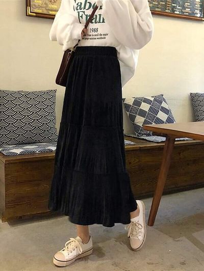 どんなトップスにも合わせやすい、着回し力抜群の黒いプリーツスカート。口コミによると、ウエストがゴムなのに、履いてもプリーツがきれいなままなのだとか。楽に履けそうですね。