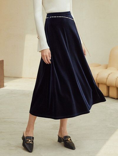 ウエストにチェーンが付いた、ベルベット生地のフレアスカート。ロング丈でエレガントな印象です。口コミによると、サイズは少し大きめに作られているようです。いつものワンサイズ下を買うとちょうどよいかもしれませんね。