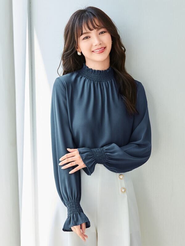 シンプルなモックネックのブラウス。口コミによると、想像以上にしっかりしていて、写真より少し黄色がかかった生地のようです。シルクのような上品な光沢があり、高見えする1枚のよう。