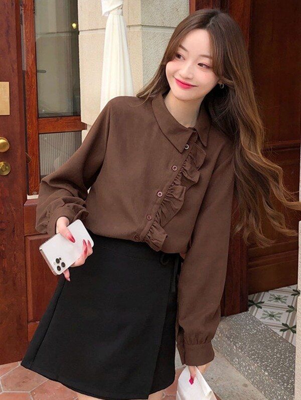 Honeyspot 無地柄 フリルトリム 斜めボタン シャツ
